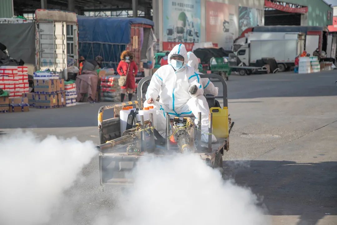 檢疫檢測工作實行輪班制,確保24小時有防疫人員在崗在位,通過排查檢測,嚴防新冠疫情流入市場。在市場內,工作人員和消殺車輛對園區各個角落進行反復消殺,確保園區安全無死角。