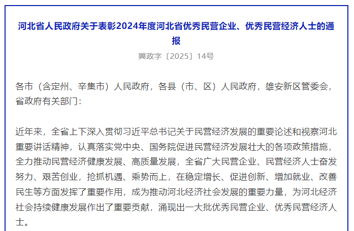 4月29日,河北省人民政府發布《關于表彰2024年度河北省優秀民營企業、優秀民營經濟人士的通報》,授予首衡集團等100家知名企業“2024年度河北省優秀民營企業”榮譽稱號。