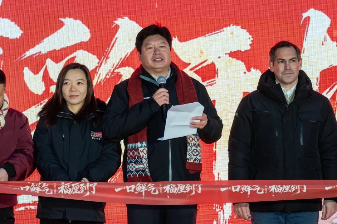 隨后,活動進入激動人心的剪彩環節。首衡果品協會執行會長、明晉隆負責人劉曉智在剪彩前,代表聯合開柜的十大商戶,正式宣布了面向采購商的終極福利——“采購競速,贏華為Mate80”活動規則:在12月8-10日三天內,于指定十家商戶累計采購車厘子(按5kg/件計算)總量排名前十的采購商,將每人獲得一部華為Mate80手機一臺!此言一出,現場掌聲雷動,將氣氛推向高潮。