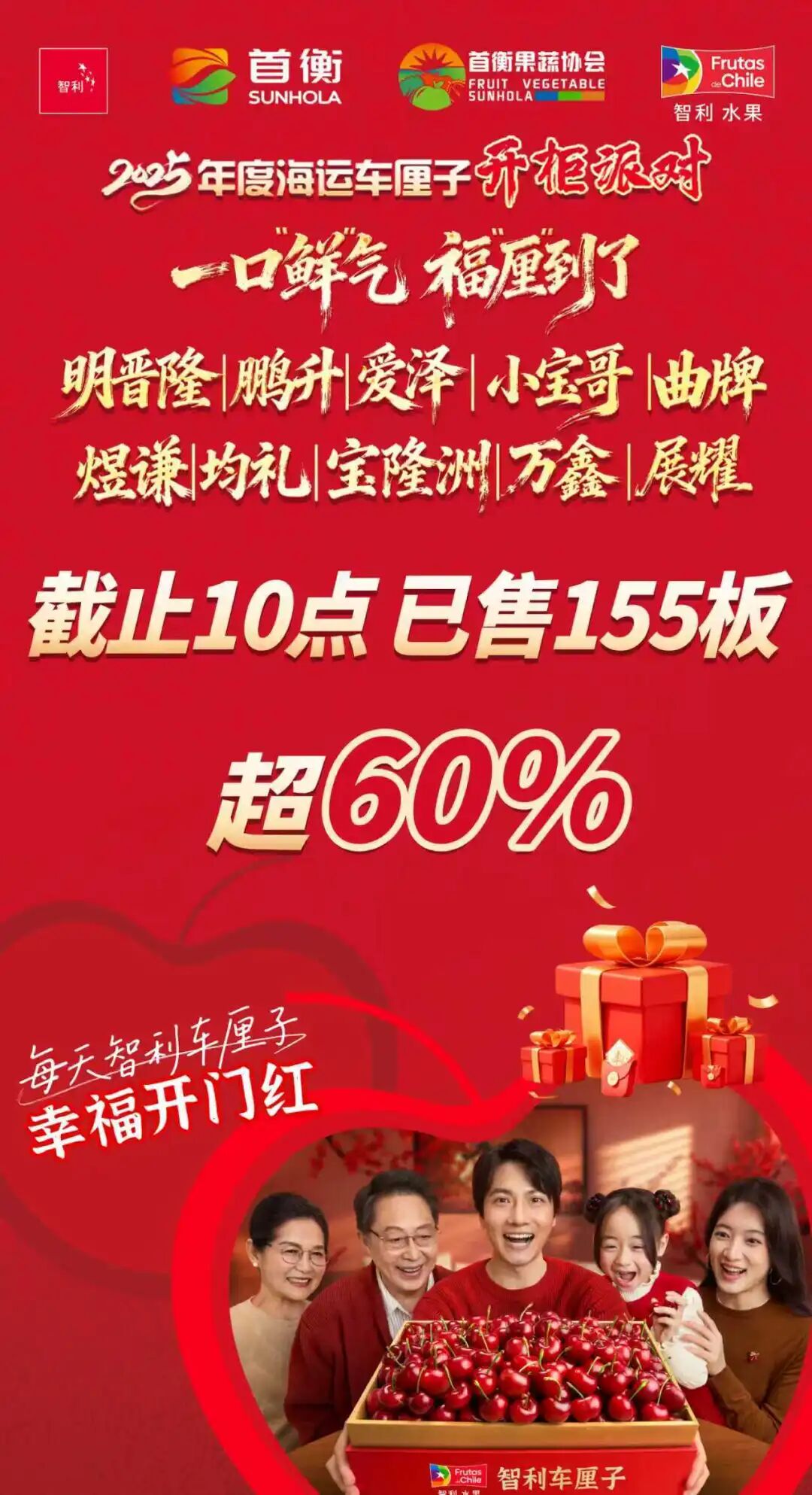 活動捷報隨即傳來:截至當天上午10時,首批開柜車厘子已被搶購155板,占開柜總量的60%以上。這一開柜即售罄的火爆場面,有力印證了市場對今年車厘子品質的高度認可,更預示著本產季的強勁開局!